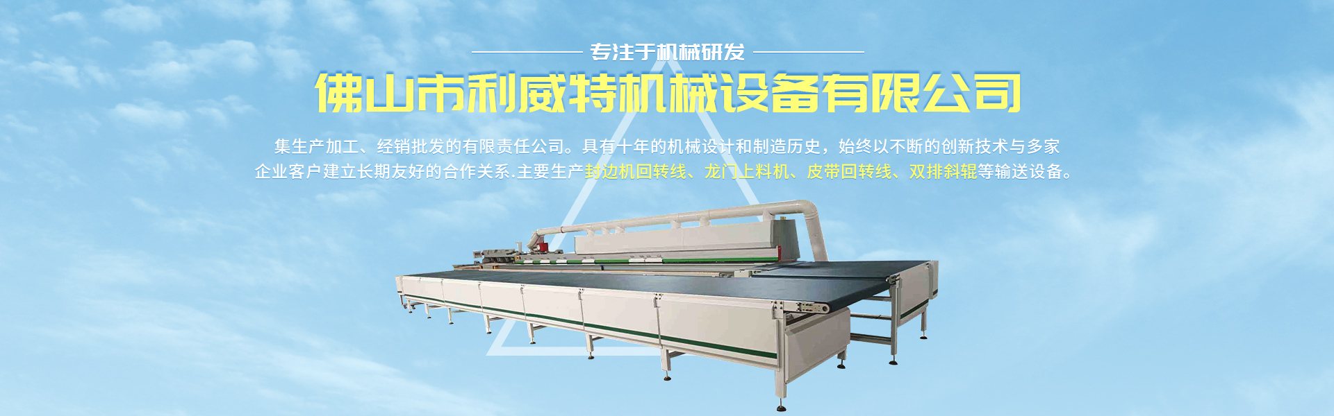 佛山市利威特机械设备有限公司原来专业研发、生产木工薄板设备,公司重组后转型生产封边机回转线、六面钻回转线、同向回转线、皮带回转线、龙门上料机、弯道机、气浮台、等输送线设备。